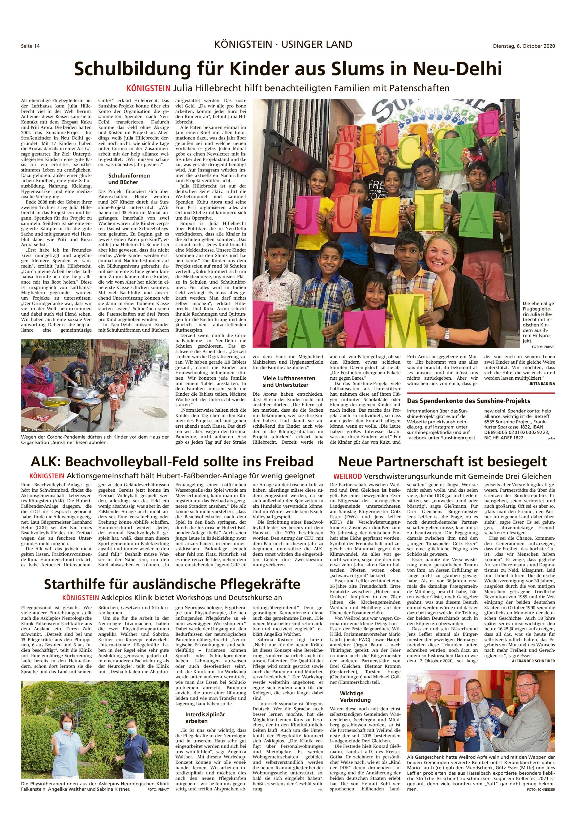 Taunuszeitung 21.11.2020 KÖNIGSTEIN – Spendenkugel-Aktion soll Straßenkindern in Neu-Delhi die Chance auf ein etwas besseres Leben schenken Für einige Kinder in den Slums von Neu Delhi gehört schon die Sicherung der täglichen Mahlzeit zu den Wünschen, die ihre Eltern mitunter kaum erfüllen können. Das Sunshine Project tritt hier –
